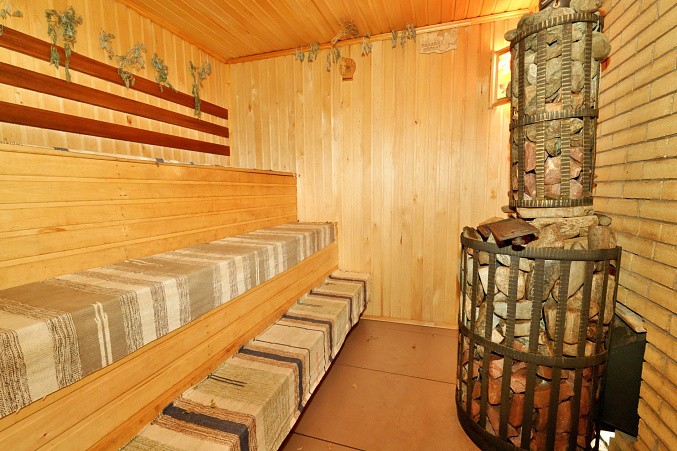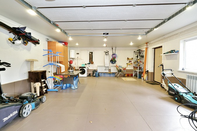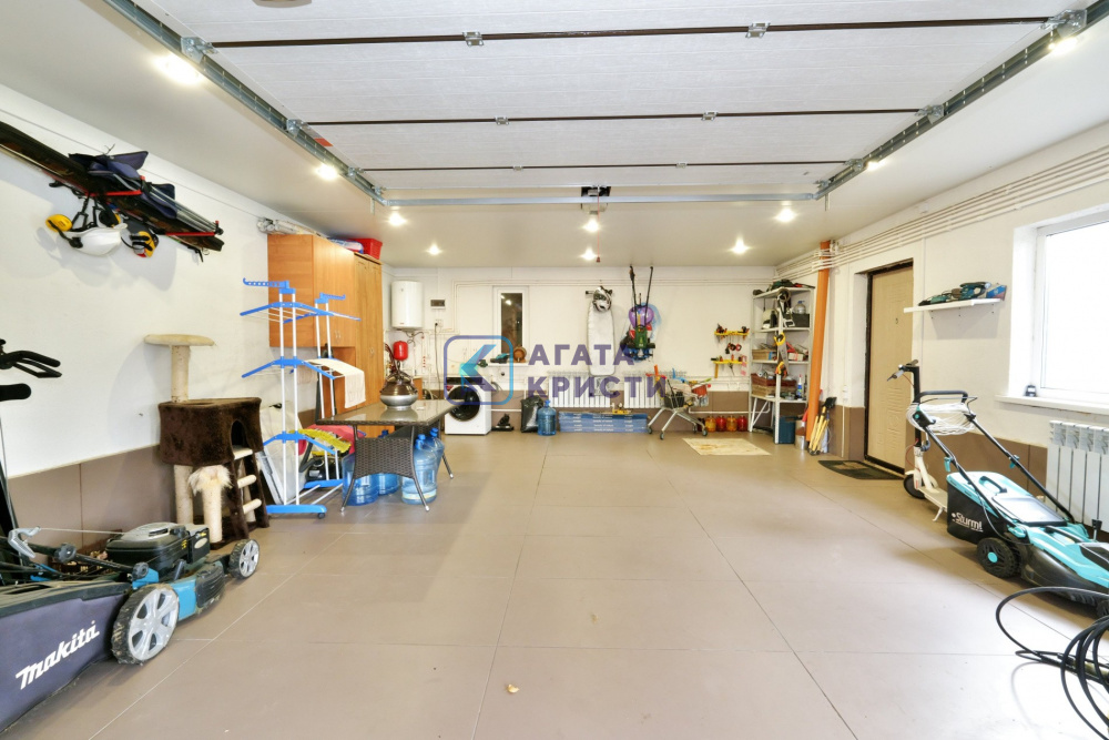Навес для автомобиля с проездом в просторный гараж. Гараж отапливается, подведена горячая и холодная вода. Под гаражом глубокий погреб. Баня 64 кв.м с вместительной душевой и парилкой.