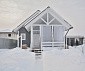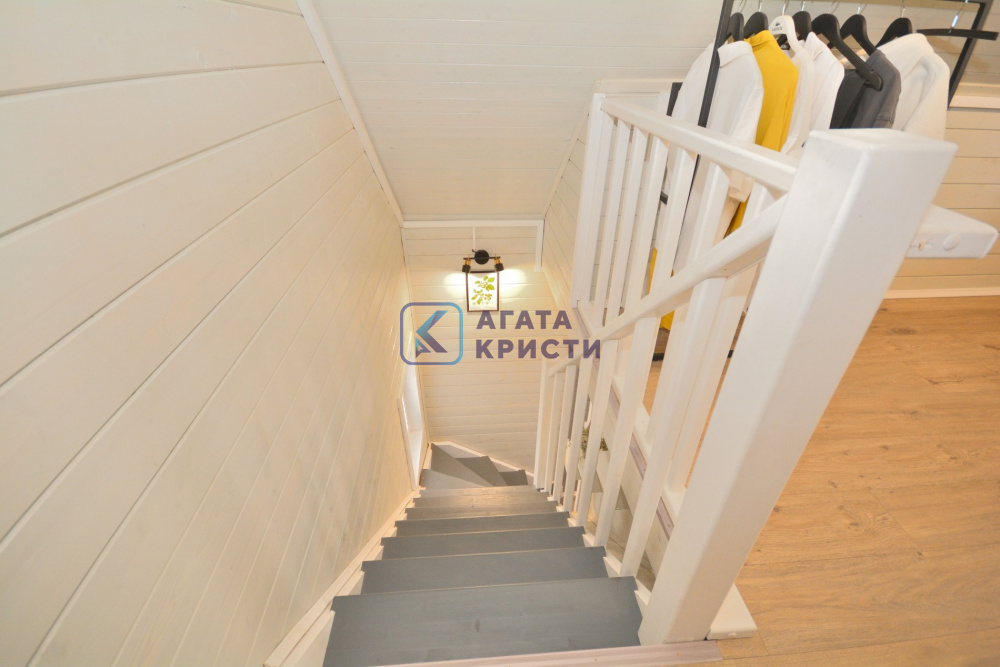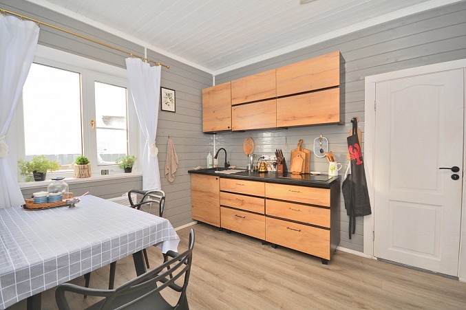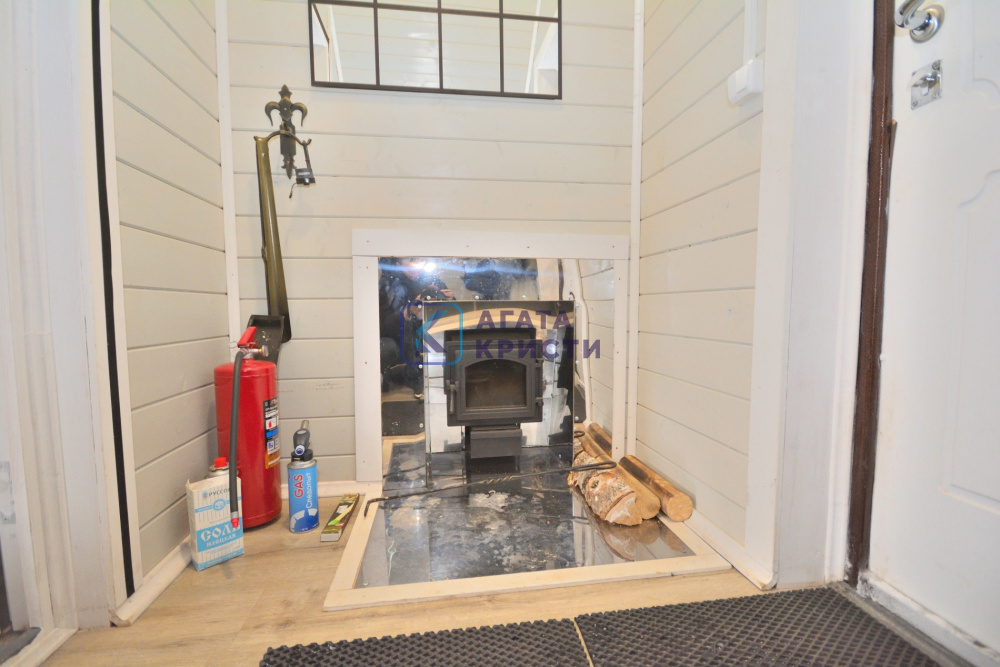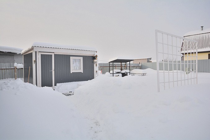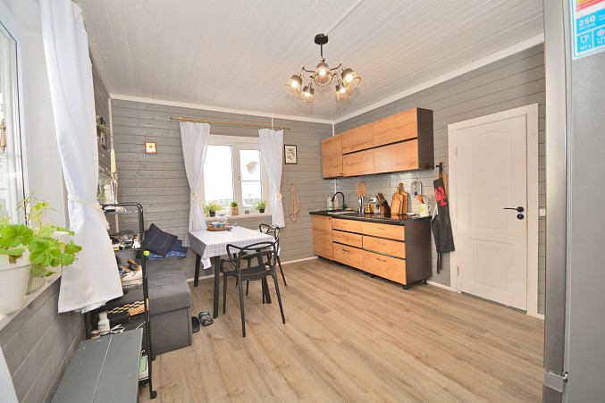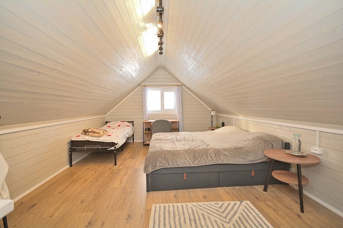 В доме при входе открытая терраса, на первом этаже кухня-гостиная, парная, моечная, санузел, на втором этаже жилая комната. Дом отапливается конвекторами.
