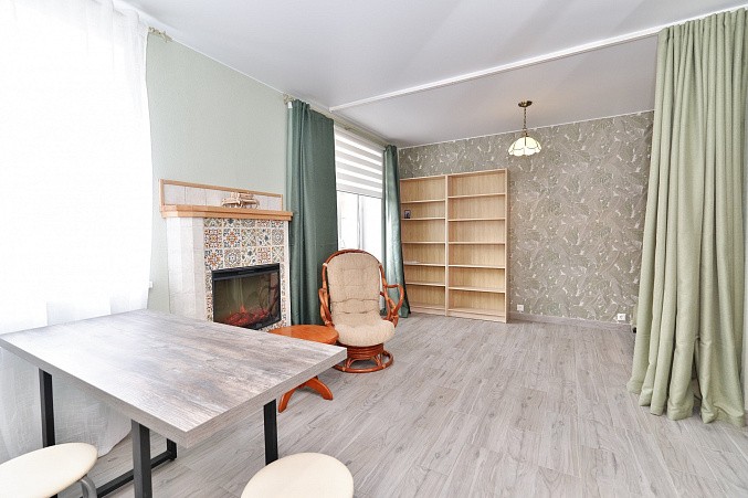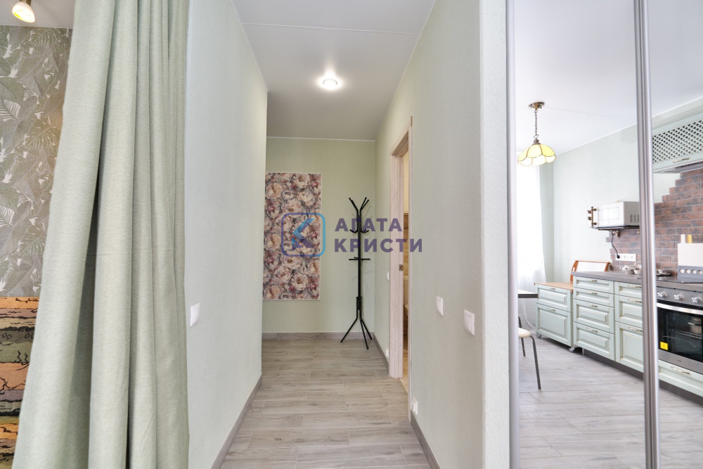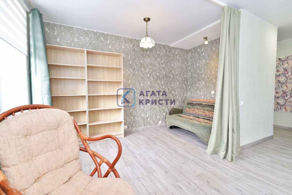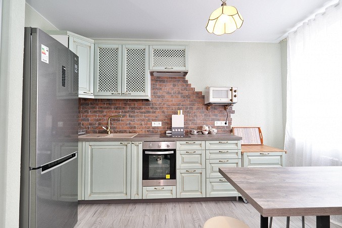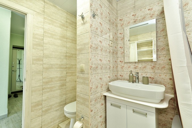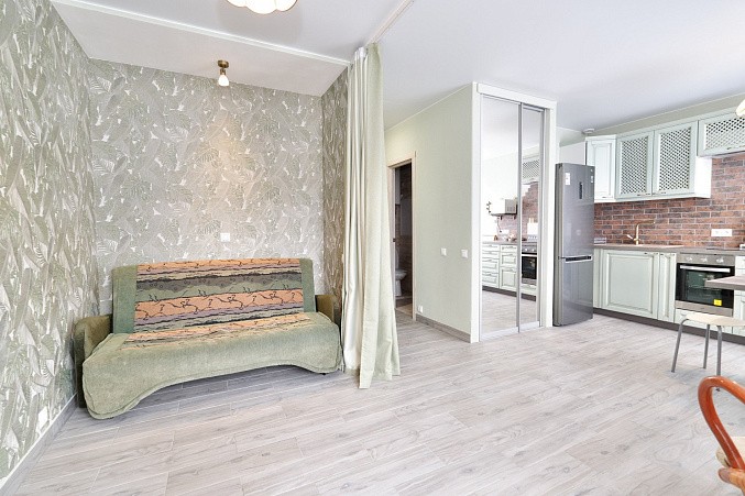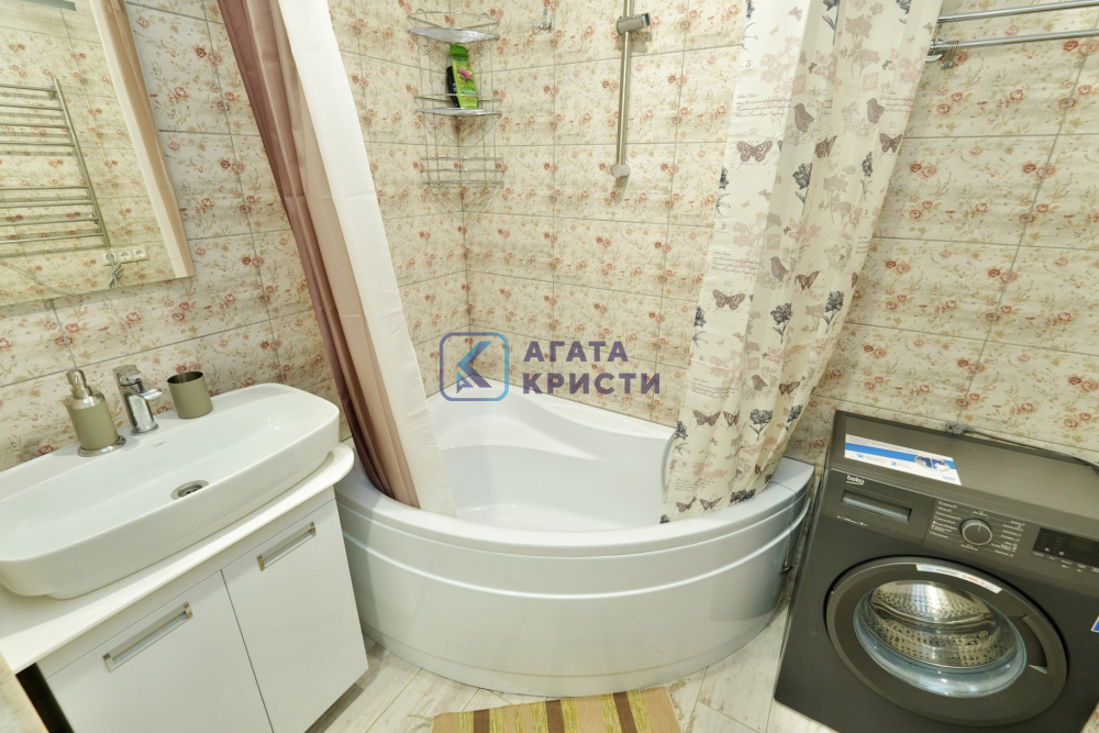 В квартире новая качественная дизайнерская отделка. Металлическая дверь, окна-стеклопакеты, на полах плитка с электроподогревом, на стенах декоративная штукатурка, обои. Есть зеркальные шкафы-купе, стильная кухонная мебель, холодильник, СВЧ-печь, духовка, электроплита, воздушный фильтр, вытяжка, обеденный стол с табуретами. Раскладной диван 160см. Электрокамин, ТВ, интернет, сушилка для белья. Санузел совмещенный, есть стиральная машина, накопительный водонагреватель, угловая ванна, умывальник с зеркалом, унитаз, шкаф с полками. Санузел снабжен поручнями для удобства маломобильных граждан.